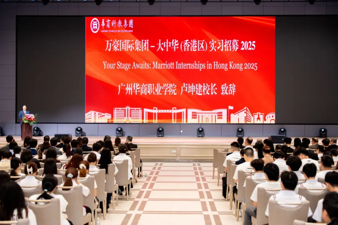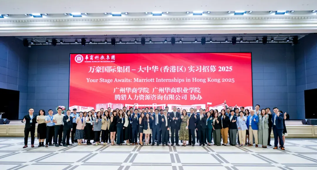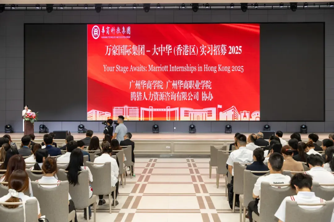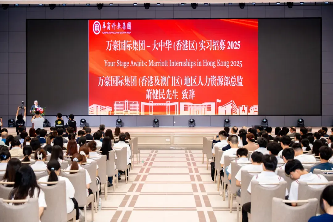 2025年10月10日下午,万豪国际集团-大中华(香港区)2025年实习招募会在华商国际会议中心大礼堂举行。本次招募会由华商科教集团旗下广州华商学院、广州华商职业学院及万豪国际集团-大中华(香港区)主办,腾猎人力资源咨询有限公司协办,旨在为学生提供国际化实习机会,拓展职业视野,深化校企合作,共同推动酒店业界人才培养模式的创新。万豪国际集团(香港及澳门区) 地区人力资源总监萧健民先生及其集团𣄃下12家酒店的人力资源总监,腾猎人力资源咨询董事总经理陈美玲一行,华商科教集团高级顾问刘惠平、副总裁廖旭东,广州华商学院首席科学家陈新滋、校长胡军、党委书记陈玉欢,广州华商职业学院校长卢坤建、党委书记翁礼成等领导及近百名学生参加。招聘会由华商科教集团投融资及投资者关系总监杨碧桦主持。